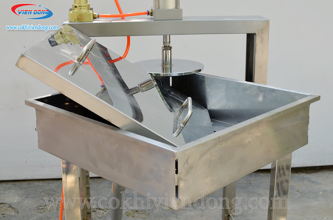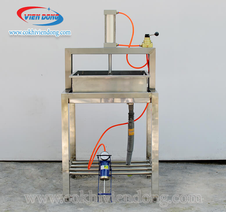 Máy ép khuôn đậu phụ là thiết bị quan trọng đảm nhiệm bước cuối cùng trong công đoạn làm đậu, chính là định hình và hoàn thiện sản phẩm. Toàn bộ thân máy đều được làm bằng inox cao cấp hạn chế han gỉ, sáng bóng, đảm bảo vệ sinh. Chân máy thiết kế cao vừa tầm người đứng để sử dụng thuận tiện nhất. Phía dưới có khung inox tiện lợi để có thể sử dụng đựng đồ.